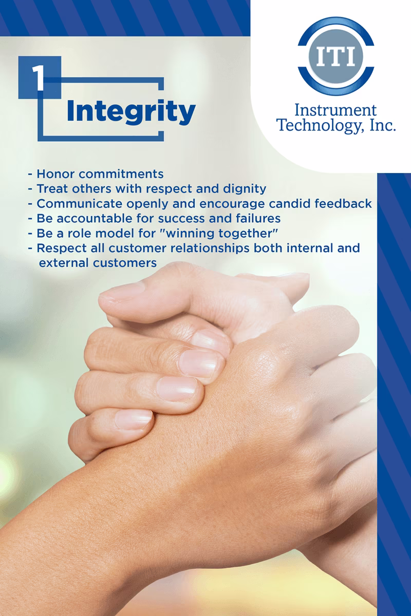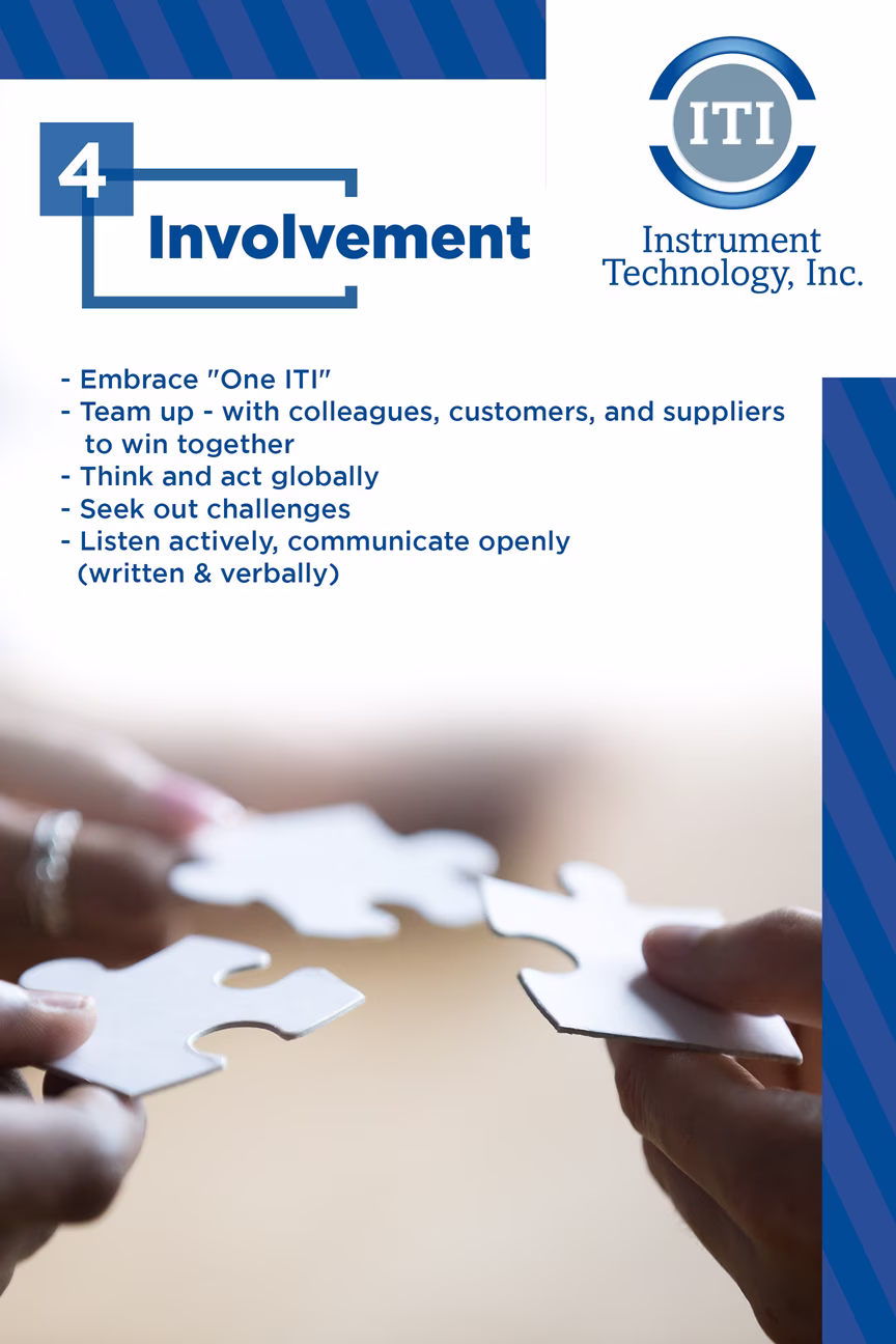 We embrace the "One ITI" philosophy, working collaboratively as a cohesive unit. Our team collaborates with colleagues, customers, and suppliers to achieve common goals. We think and act globally, expanding perspectives and opportunities, and actively seek out challenges, viewing them as opportunities for growth. Listening actively and communicating openly, both in written and verbal forms, ensures clarity and understanding across all levels of our organization.
